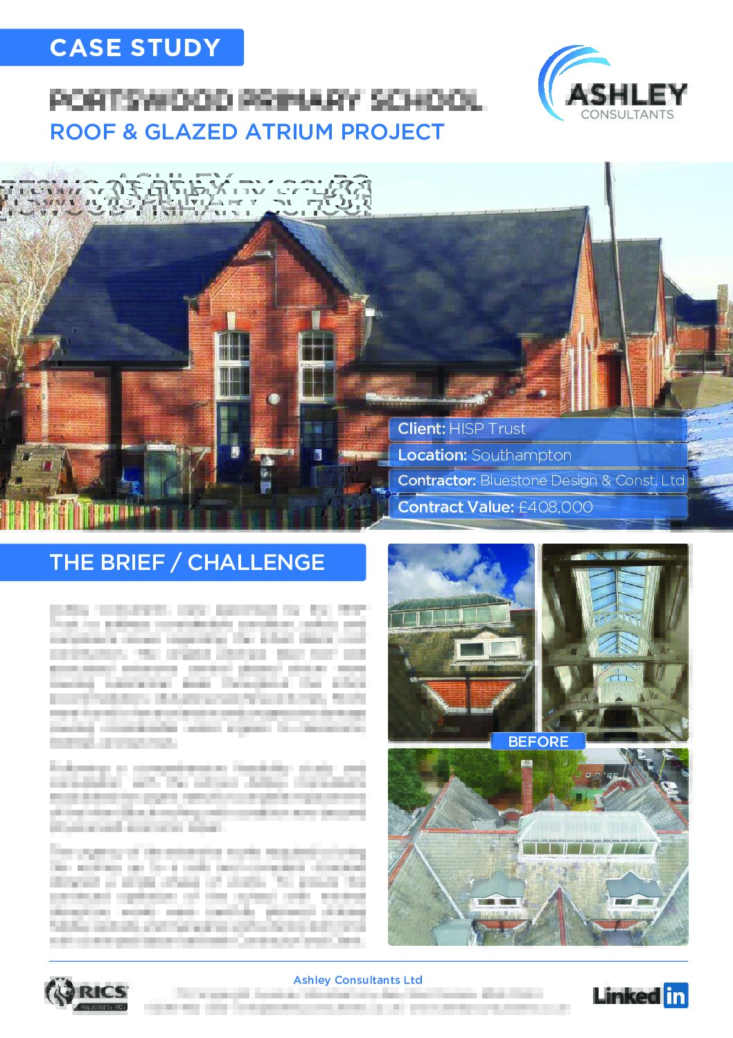 Following a comprehensive feasibility study and consultation with the school, Ashley Consultants established the urgent need for complete replacement of the Infant Block roofing, with condition now beyond physical and economic repair.