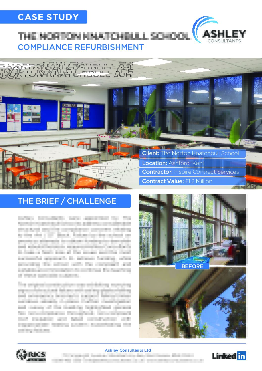 Ashley Consultants were appointed by The Norton Knatchbull School to address considerable structural and fire compliance concerns relating to the Art / DT Block. Failure by the school on previous attempts to obtain funding to demolish and rebuild the block, required Ashley Consultants to take a fresh look at the issues and the most successful approach to achieve funding, while providing the school with the compliant and suitable accommodation to continue the teaching of these specialist subjects.
